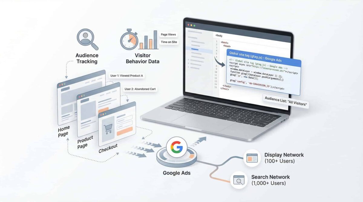 The Google Ads tag (also called the global site tag or gtag.js) is a small piece of JavaScript that you install across your website. It tracks visitor behavior and feeds that data back into your Google Ads account so you can build audience lists.